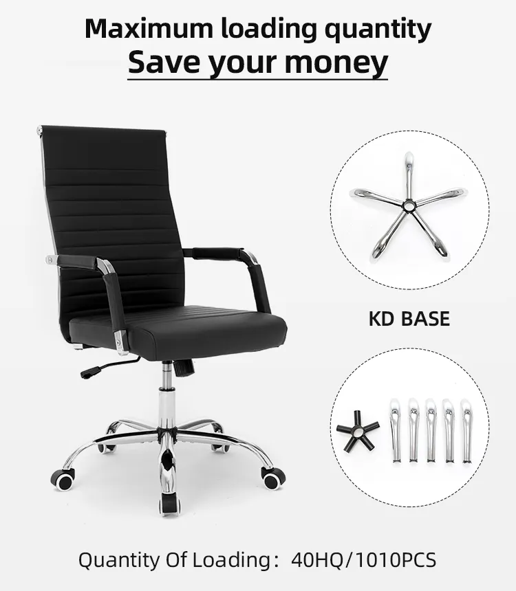 Материјал: PU Механизам: Механизам со заклучување и навалување Боја: Црна Гасен лифт: Гасен лифт од класа 2 од 80 мм Стил: Извршен стол, стол за кревање, ротирачка стол Основа: хромирана основа од 320 мм Потпирач за раце: Хромиран потпирач за раце Големина на производот: 51*58*100-108CM Пакување: 1PC/CTN Големина на пакување: 70*20,5*47 см Количина на вчитување: 1010 парчиња / 40 штабови